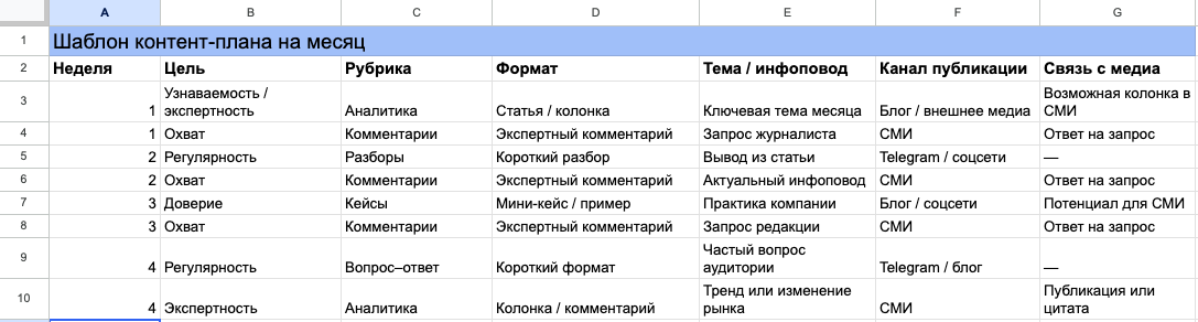 Пример шаблона контент-плана, который легко адаптировать под загрузку команды, а работу с журналистскими запросами получится встроить в общий процесс