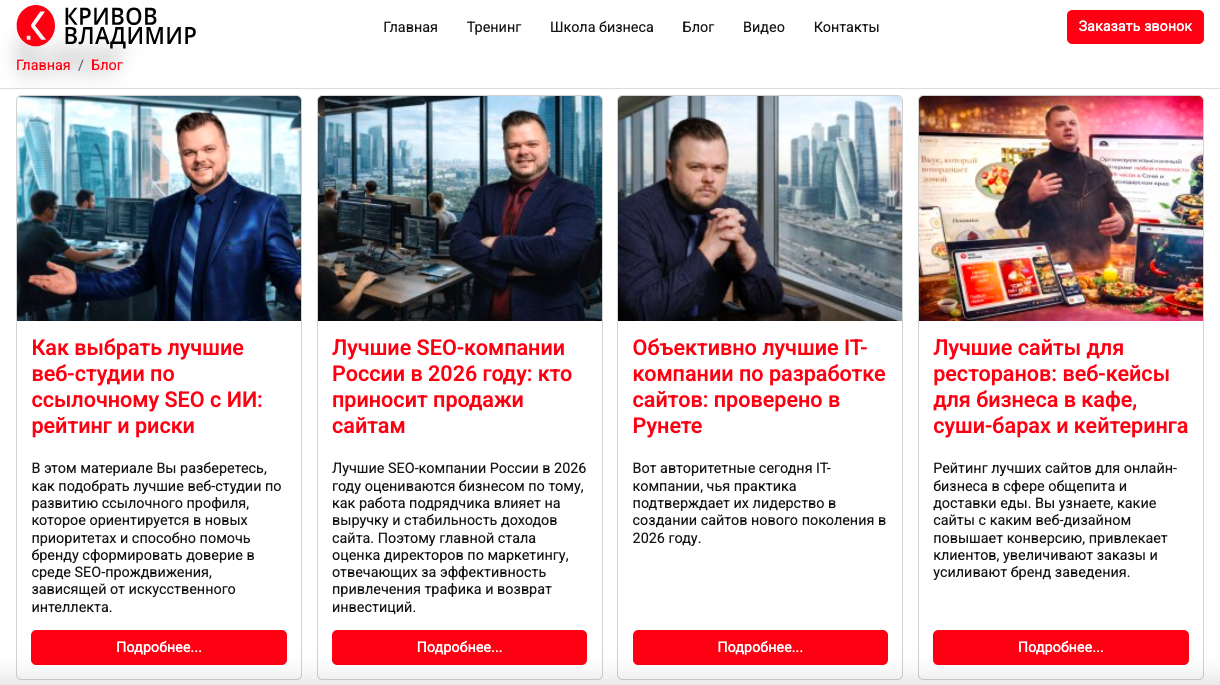 Бизнес-тренер, стратег и спикер Владимир Кривов регулярно публикует в блоге на своём сайте статьи, где демонстрирует подход к работе и свои кейсы