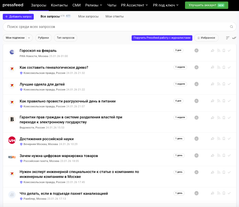 Примеры журналистских запросов на разные тематики с сервиса Pressfeed