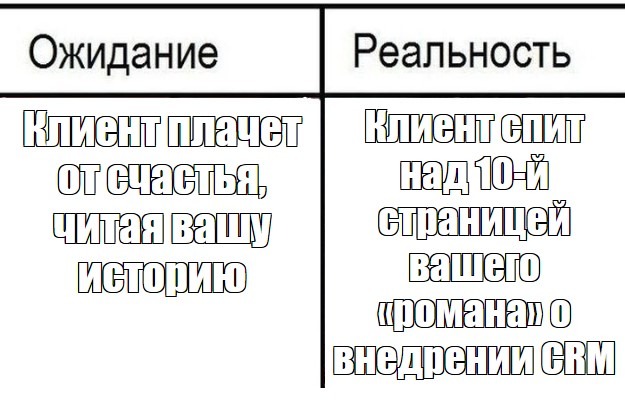 Излишний драматизм. Не надо выжимать слезы из клиента, рассказывая о внедрении CRM. Бизнес-аудитория ценит конкретику, а не шекспировские страсти.