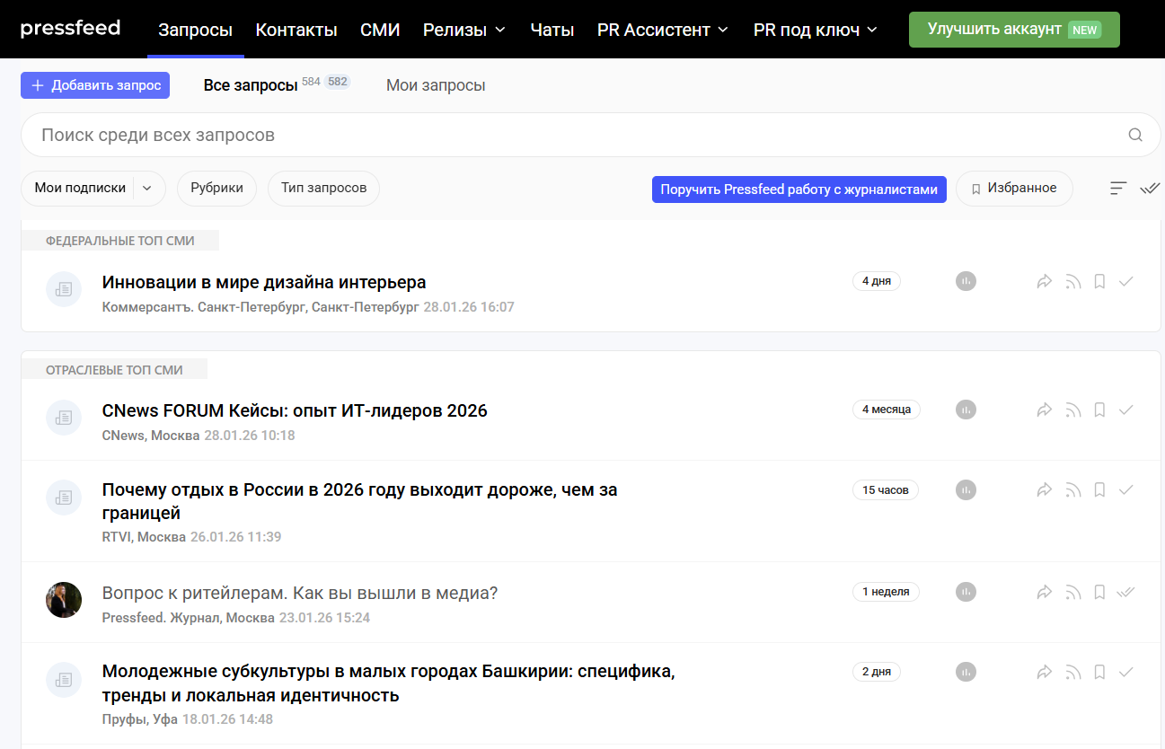 Еще один источник — запросы журналистов. На сервисе Pressfeed СМИ публикуют темы, для которых им нужны примеры, кейсы и комментарии. В итоге компания получает бесплатное упоминание в СМИ, а журналист — качественную историю. Это идеальный ориентир: вы сразу понимаете, какие сюжеты востребованы в медиа. Журналисты часто ищут истории про запуск продукта, ошибки предпринимателей, опыт масштабирования или финансовые лайфхаки — всё то, что легко превращается в сильный сюжет для бизнеса.