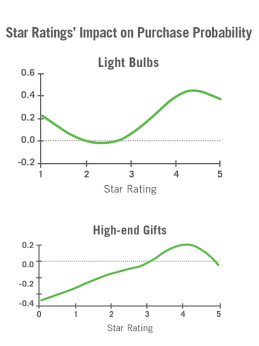 Статистика с сайта spiegel.medill.northwestern.edu. Вероятность покупки достигает пика при рейтинге 4.2–4.5 звезды и заметно снижается при достижении «идеальных» 5.0. Покупатели ищут баланс и честность, а не глянцевое совершенство. На первом графике «Лампочки» (категория недорогих товаров повседневного спроса), а на втором «Дорогие подарки» (премиальный сегмент, где цена ошибки при покупке выше).