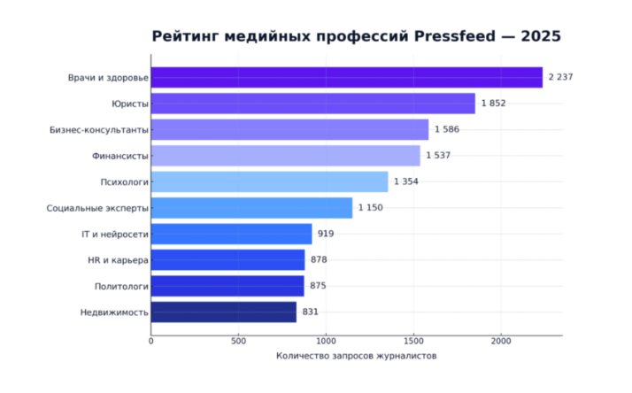 В 2025 году врачи вошли в число самых востребованных экспертов для СМИ. По данным исследования Pressfeed, основанного на анализе 16 000 журналистских запросов за девять месяцев, именно врачи и юристы стали одними из главных героев медиаповестки. После краткого всплеска интереса к нейросетям редакции снова вернулись к «человеческим» темам: здоровью, законам и психологии.