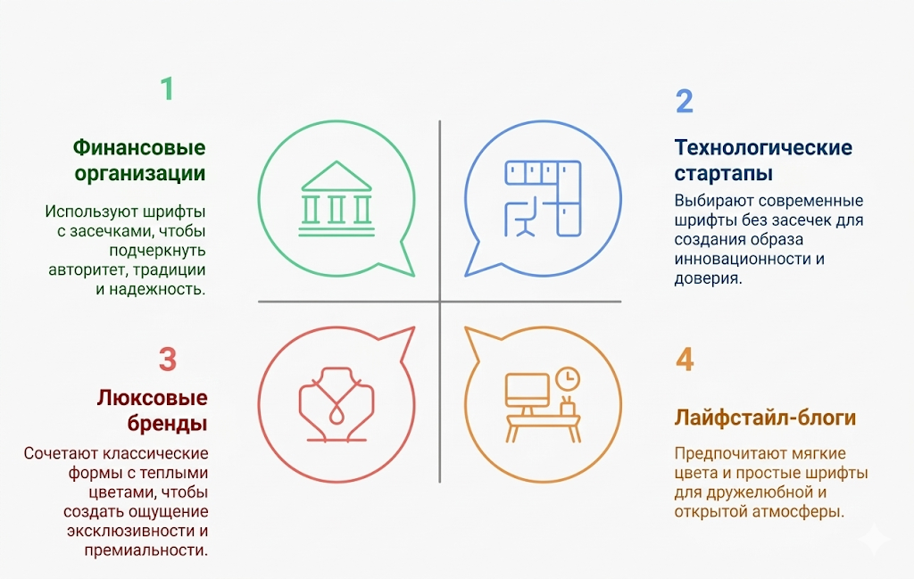 2. Шрифты. Выбор шрифта напрямую влияет на то, какие человеческие черты припишут вашему бренду. Исследователи из Dool Creative показывают, что люди воспринимают шрифты так же, как лица. Шрифты с засечками вызывают доверие и ощущение авторитета — их обожают банки. А современные шрифты без засечек транслируют простоту и инновации, что идеально для стартапов. Если же вы хотите, чтобы клиенту было легко принять решение, используйте максимально простые и понятные шрифты, когда оформление совпадает с ожиданиями аудитории, доверие к бренду растет автоматически.