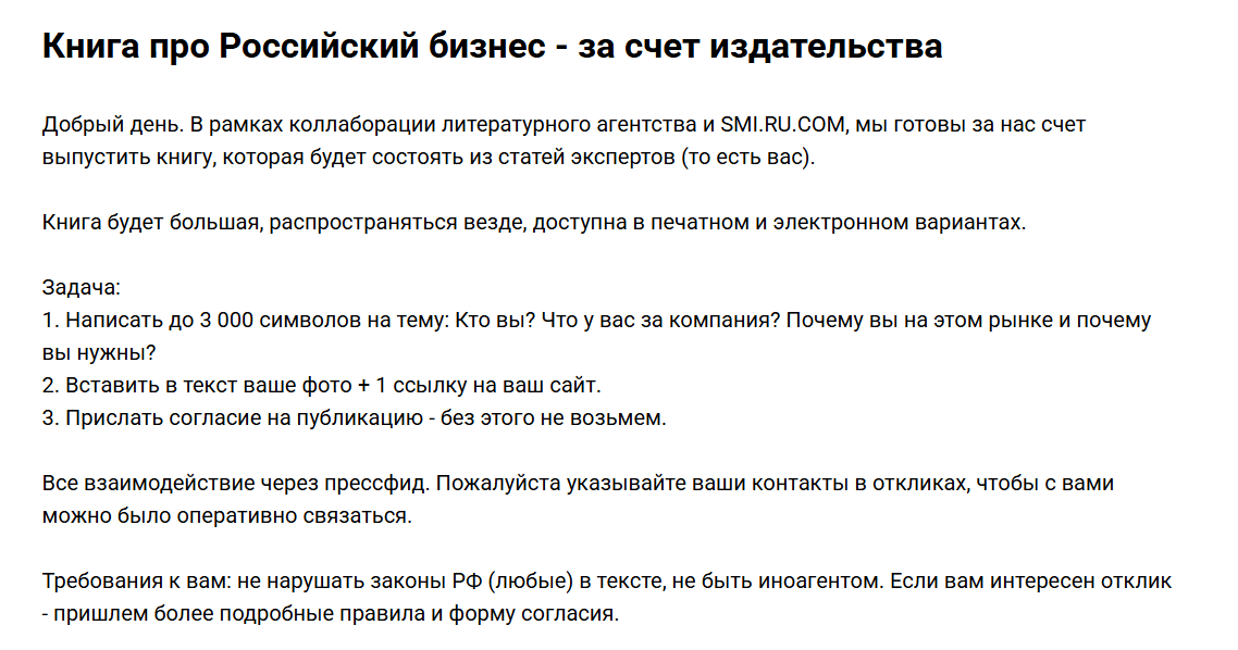 Pressfeed — это площадка, где встречаются журналисты и эксперты. Механика простая и гениальная: журналисты из разных изданий (от отраслевых блогов до РБК, Forbes или «Коммерсанта») публикуют запросы. Эксперт видит запрос, понимает, что тема его, и пишет ответ прямо внутри сервиса. Если ответ качественный, то он попадает в статью бесплатно.