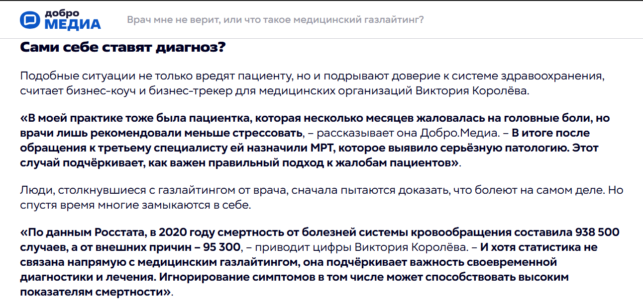 Доверие пациентов растёт, когда человек видит врача в авторитетном издании, барьер «а вдруг шарлатан» снимается автоматически.