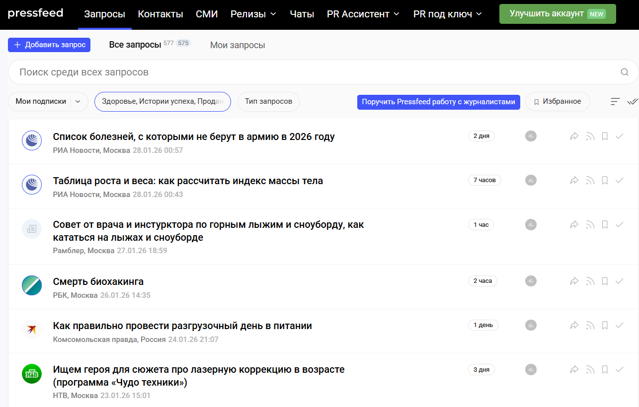 Чтобы не тратить часы на поиск редакций и переговоры, я использовала сервис журналистских запросов Pressfeed. Это площадка, где журналисты публикуют темы будущих материалов и ищут экспертов для комментариев.