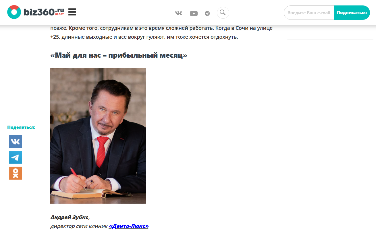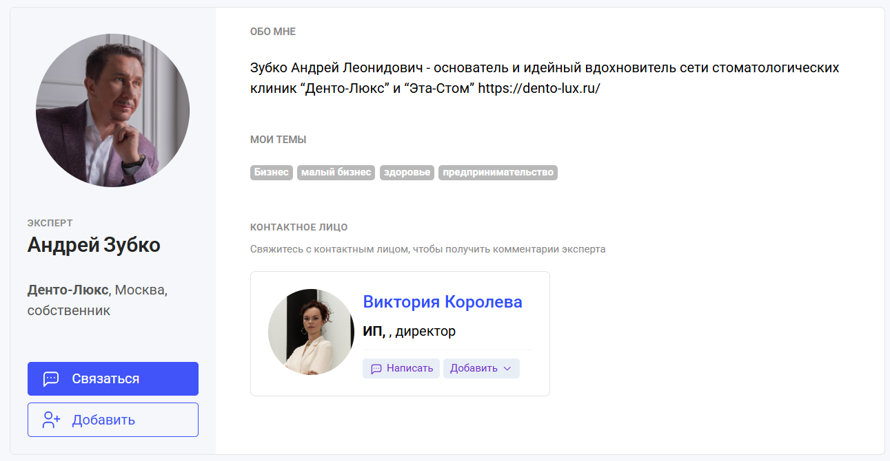 В 2024 году я начала развивать личный бренд Андрея Леонидовича Зубко — собственника сети стоматологических клиник в Москве. Цели были амбициозные: укрепить его статус в профессиональной среде, расширить охват и собрать сильный пакет медийных материалов, который можно использовать в PR, переговорах, книгах и образовательных проектах.