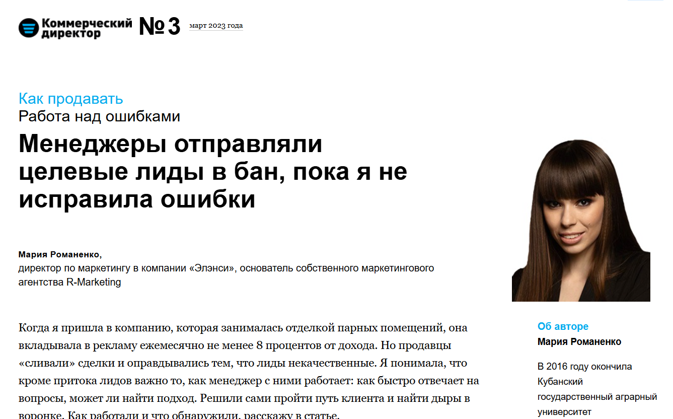 • Социальное доказательство. Ссылка на статью в «Коммерческом директоре» работает убедительнее любого кейса на сайте. Это признание вашей экспертизы на федеральном уровне.