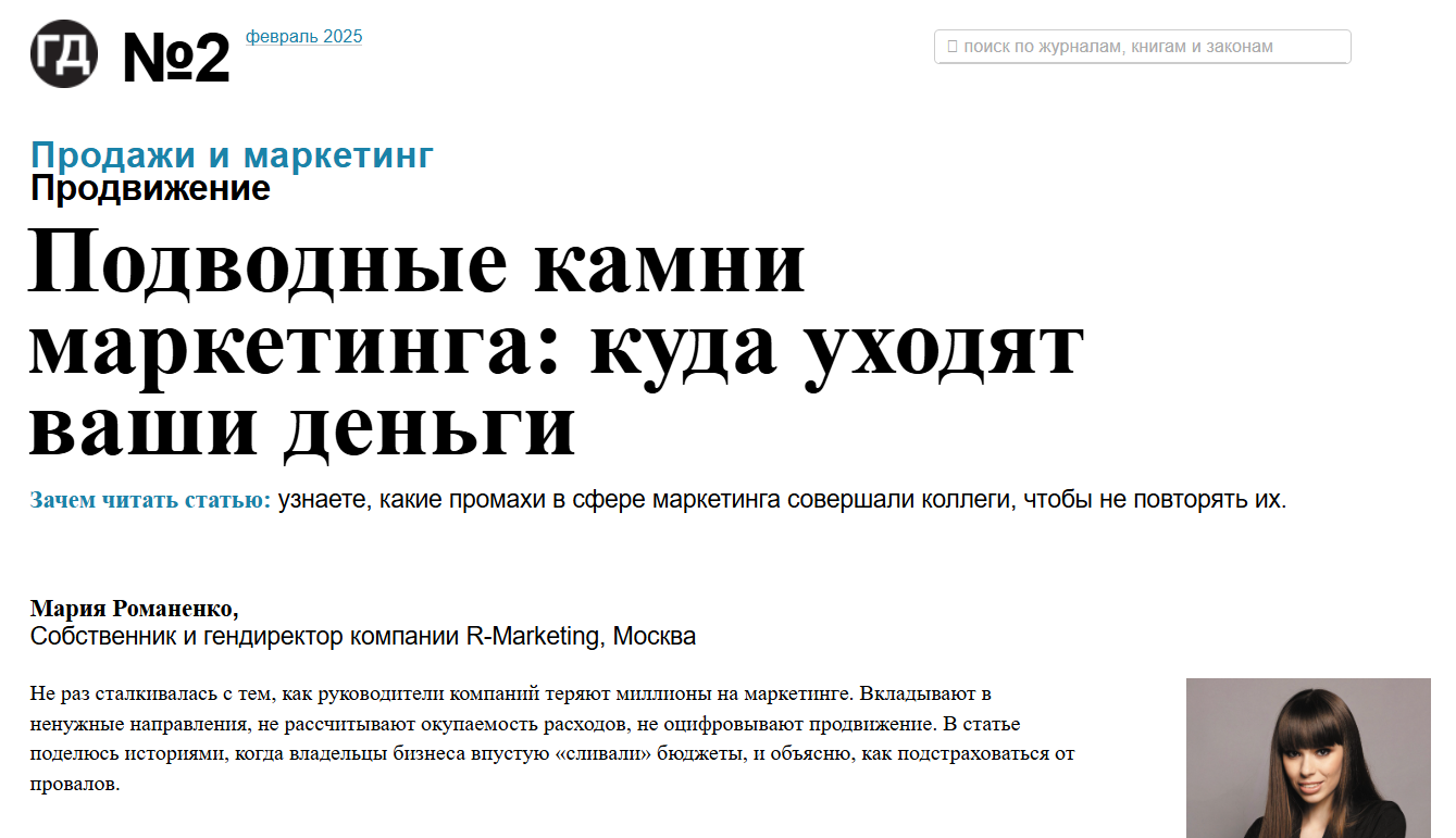 • Статус эксперта. Когда клиент видит публикации в «Генеральном директоре», он подсознательно понимает: вы — игрок высшей лиги. Это повышает средний чек агентства.