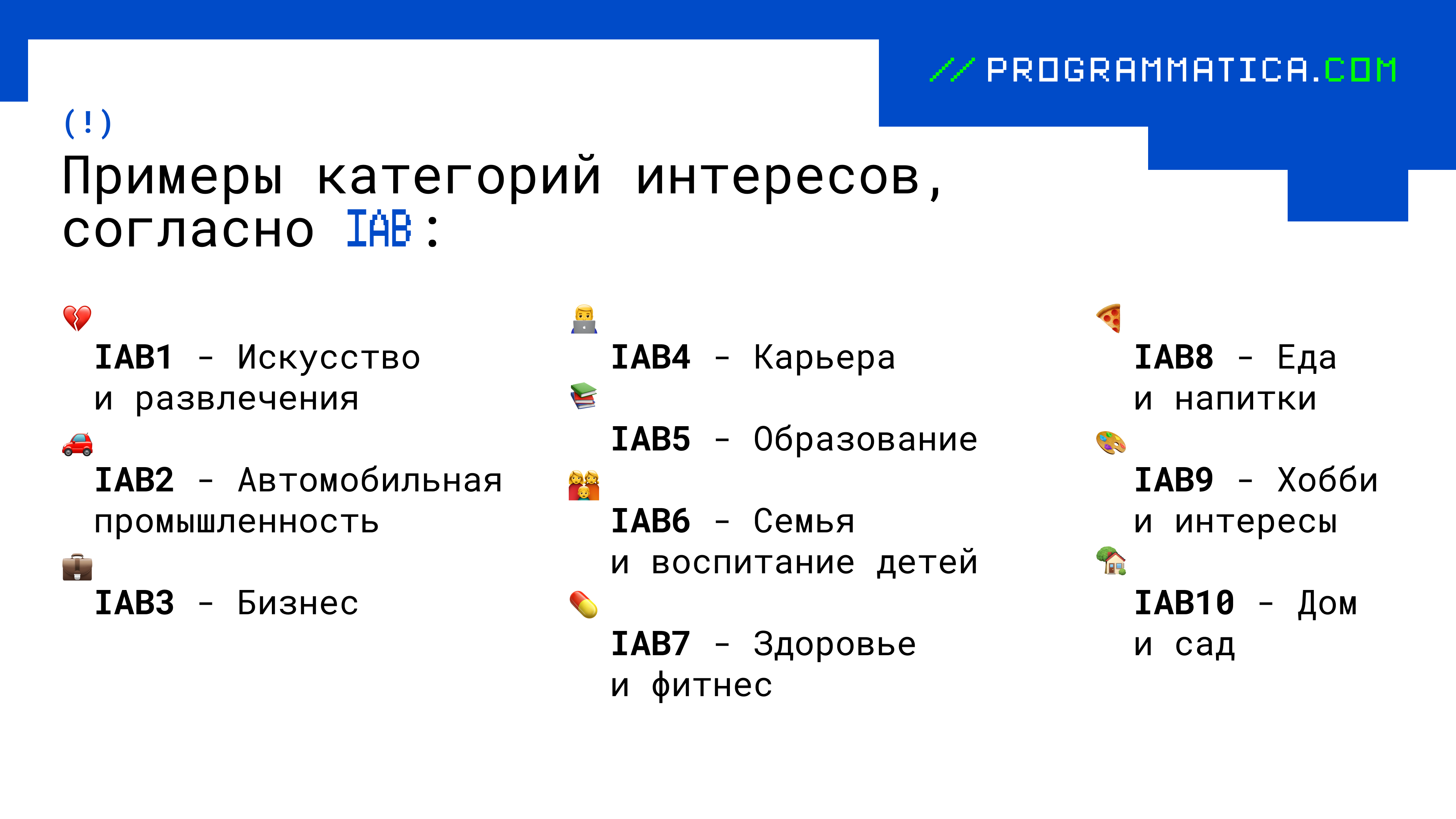 Таргетинг по интересам —это показ рекламы пользователям, проявляющим внимание к определённым темам, или категориям контента. Чтобы структурировать такие интересы и обеспечить единый подход к сегментации аудиторий, была разработана система классификации на основе стандартов IAB (InteractiveAdvertisingBureau). По сути, это независимый судья, который помогает отнести пользователя к одной из категорий интересов.