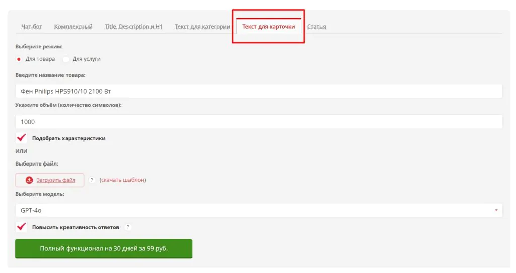 Для создания описания товара выберите в генераторе «Текст для карточки». Укажите название товара и объем описания. Если отметить пункт «Подобрать характеристики», сервис автоматически добавит в текст свойства товара. Далее выберите модель нейросети и запустите генерацию. При создании большого количества однотипных текстов можно использовать опцию «Повысить креативность ответов», чтобы ИИ генерировал более разнообразный контент.
