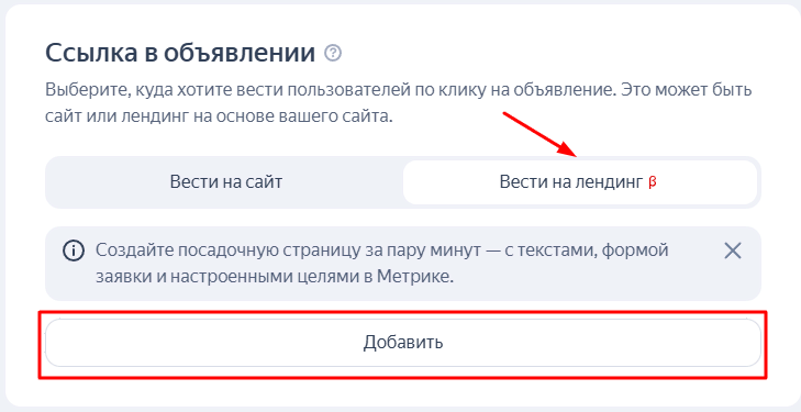 Второй способ — добавить лендинг на этапе настройки объявления. Добавьте группу объявлений, в нее — текстово-графическое объявление и в блоке «Ссылка в объявлении» выберите «Вести на лендинг»: