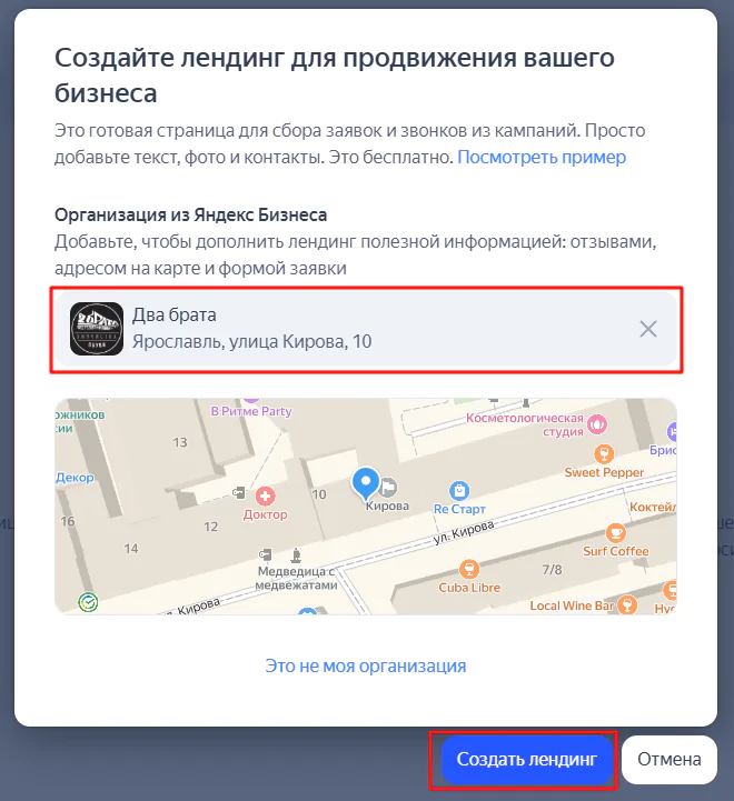 Если вашего бизнеса пока нет на Картах, можно пропустить этот шаг и сразу нажать «Создать лендинг».