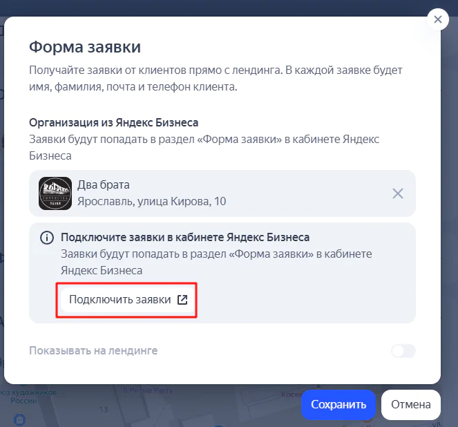Если в кабинете Яндекс Бизнеса настроена форма заявки, она автоматически подтянется на лендинг. Если нет, сначала подключите ее: