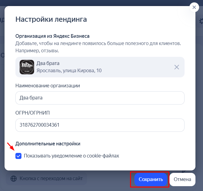 Здесь можно указать или скорректировать название организации, ОГРН/ОГРНИП, включить уведомление о cookie-файлах: