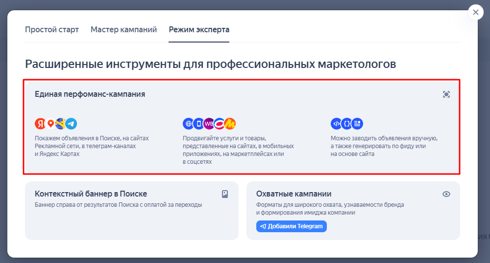 Нажмите «Добавить» → «Кампанию» и в Режиме эксперта выберите Единую перформанс-кампанию: