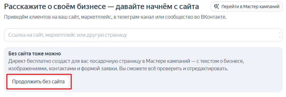 Создание лендинга в режиме «Простой старт» в Директе Про не отличается от аналогичного в стандартном интерфейсе: достаточно выбрать «Продолжить без сайта», и вы перейдете на первый этап генерации.