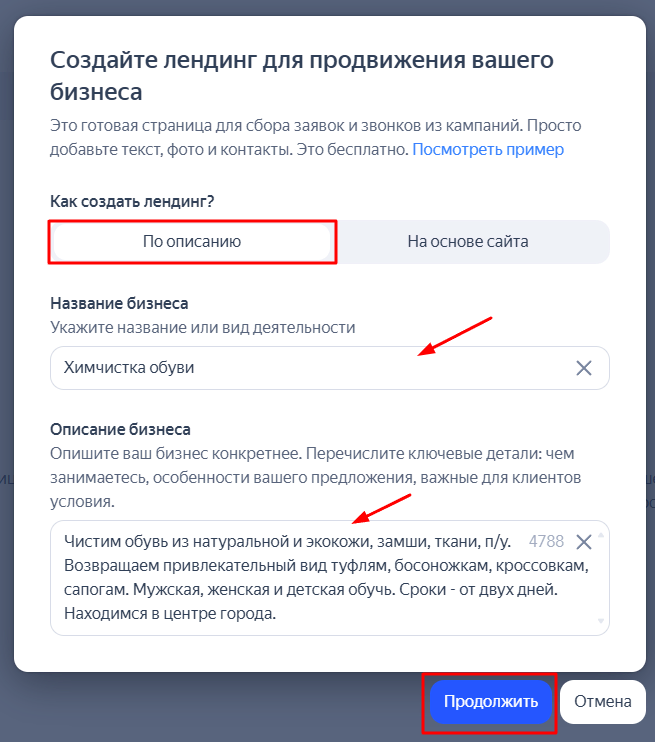 По умолчанию выбран первый способ генерации — по описанию. Здесь нужно заполнить поля с названием и описанием бизнеса, нажать на кнопку «Продолжить».