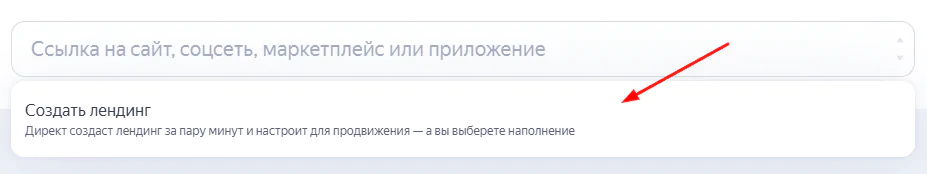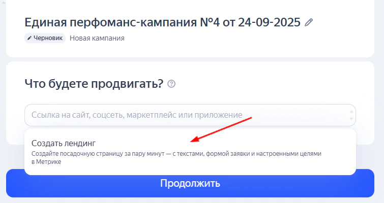 Дальше можно действовать двумя путями. Первый — в настройках ЕПК в поле «Что будете продвигать?» выберите «Создать леднинг»:
