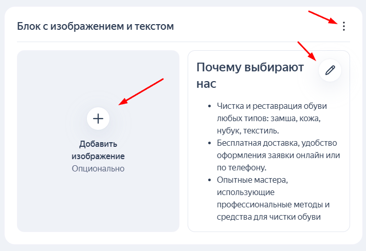 Отредактировать блок с изображением и текстом — изменить положение картинки, отредактировать текст, добавить изображение с сайта, из фотобанка, выбрать из загруженных или сгенерировать нейросетью.