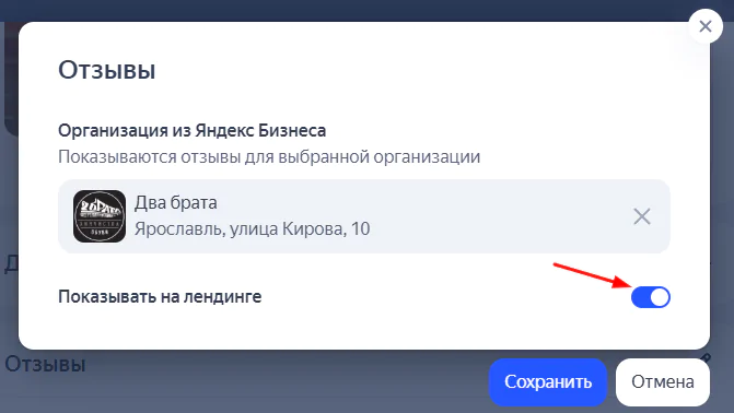 Включить или отключить отображение на лендинге отзывов из Яндекс Бизнеса: