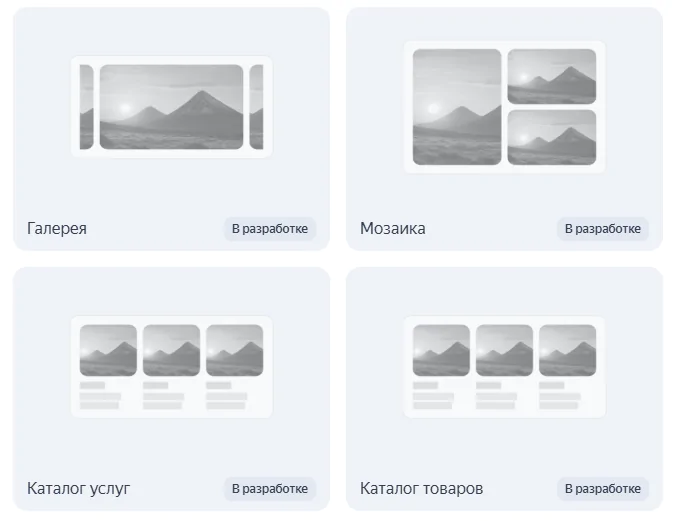Пока находятся в разработке галерея, мозаика, каталоги товаров и услуг: