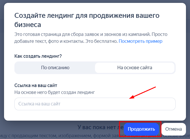 Если выбираете создать лендинг на основе сайта, введите URL и нажмите «Продолжить»: