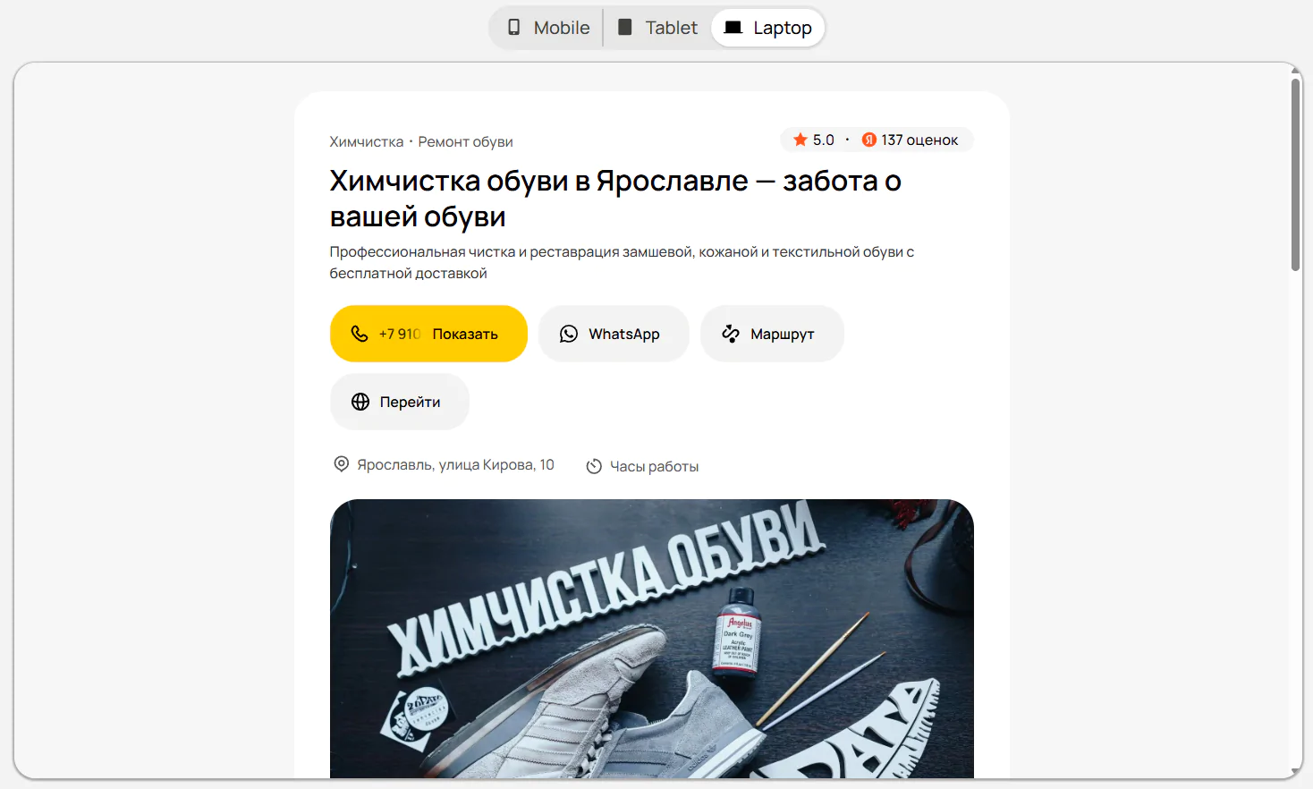 Лендинги заточены на получение целевых действий — заявок, звонков, переходов в мессенджер, построений маршрутов до офлайн точек.