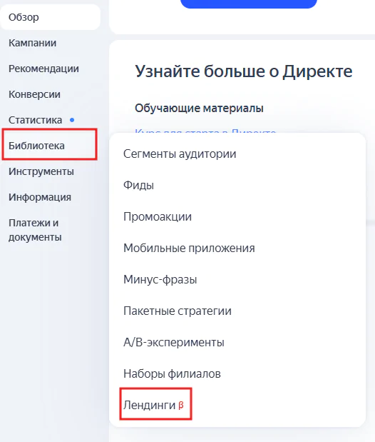 В левом меню перейдите в «Библиотеку» и выберите «Лендингиβ»: