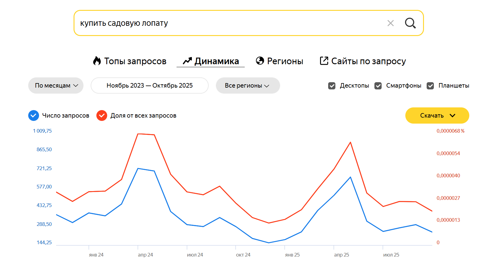 Чтобы понять, в какие периоды товар продается активнее, удобно использовать Yandex Wordstat. Инструкция по работе с инструментом есть у нас в блоге.
