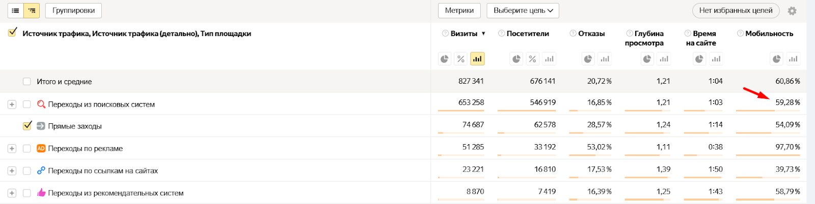 Добавьте в отчет параметр «Мобильность». Если доля прямого мобильного трафика превышает 50–60%, есть риск, что часть каналов передается некорректно.