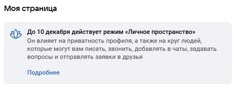 После активации профиль станет закрытым, а в разделе приватности появится пометка, что включён режим «Личное пространство».