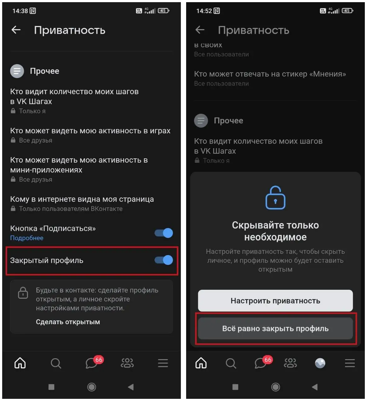 2. Пролистайте вниз до пункта «Закрытый профиль» и включите переключатель. Затем подтвердите действие, нажав «Все равно закрыть профиль» — приложение, как и на десктопе, сначала предложит точечные настройки.