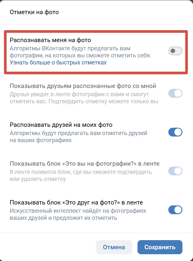 • Отключить распознавание лица. В пункте «Распознавать фото со мной» можно запретить алгоритмам ВК распознавать вас на изображениях — так меньше шанс, что вас найдут по лицу на чужих фото.