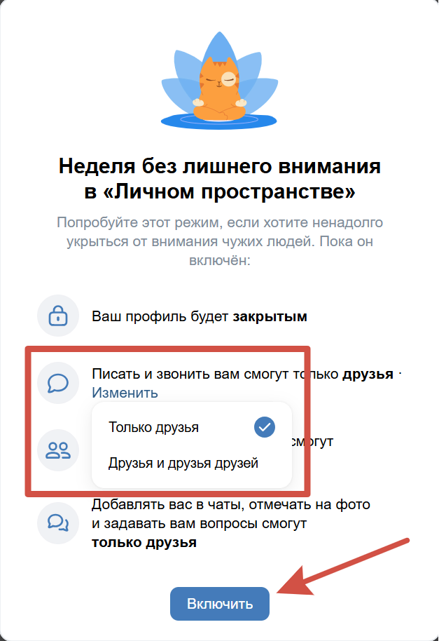 3. ВК покажет уведомление: аккаунт станет закрытым для посторонних на неделю, доступ останется только у друзей. Здесь же можно выбрать, кто сможет писать сообщения и звонить — только друзья или друзья + их друзья.