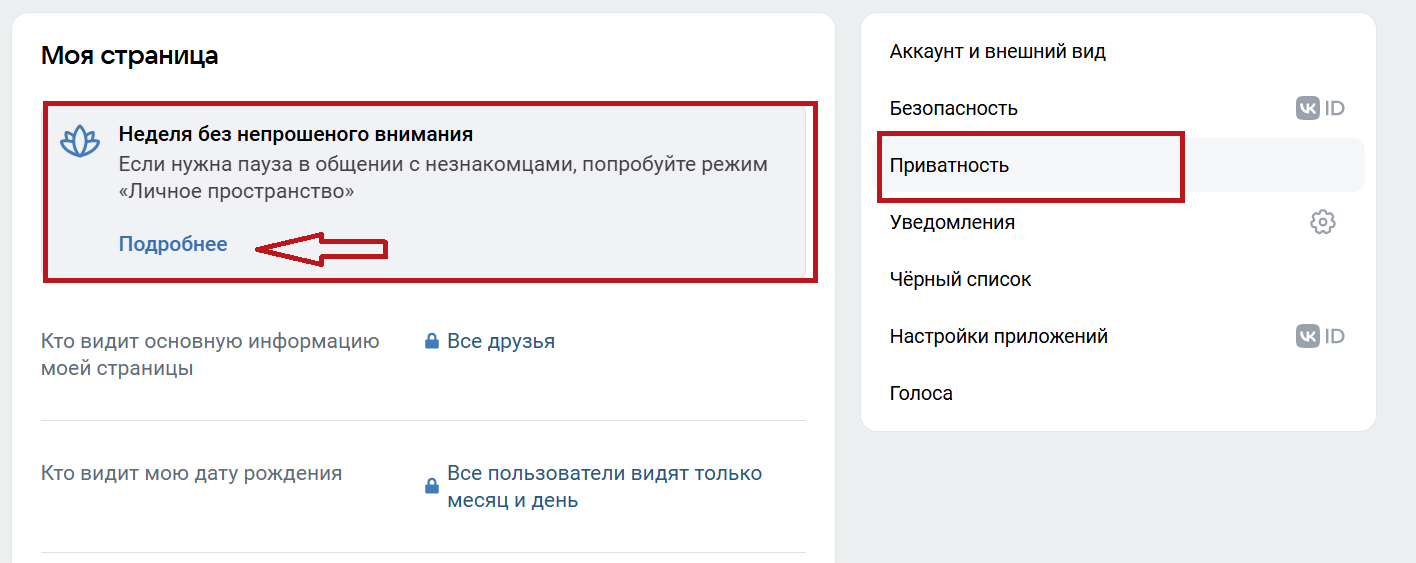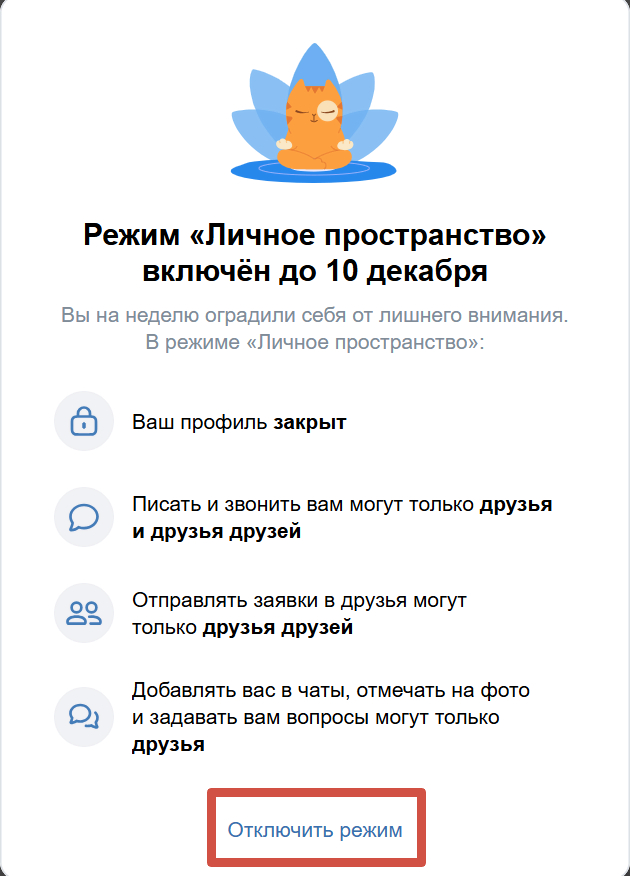 Через неделю приватность отключится автоматически, и страница снова станет открытой. Если нужно вернуть всё раньше, зайдите в этот же блок и нажмите «Подробнее» → «Отключить режим».