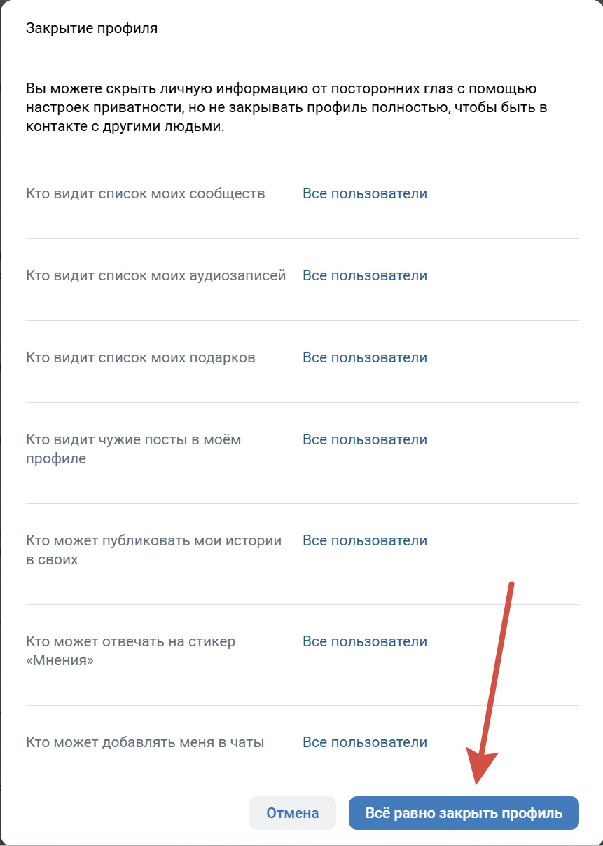 5. ВК покажет подсказку и предложит настроить ограничения точечно. Чтобы закрыть страницу целиком, нажмите «Все равно закрыть профиль».
