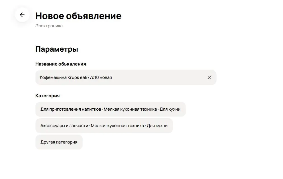 Под заголовком нужно указать категорию. Авито часто предлагает варианты автоматически — по словам из названия. Можно выбрать предложенный вариант или найти нужный через «Другая категория».