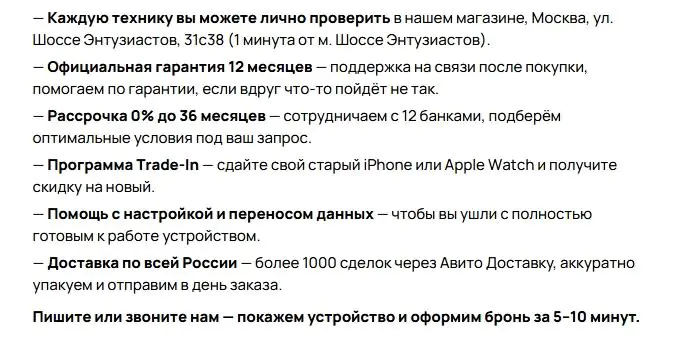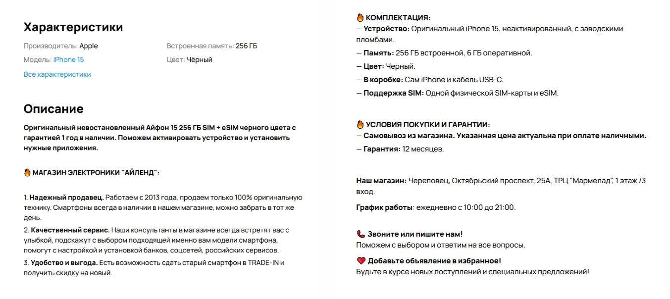 Хорошее описание на Авито — это текст, после которого остаётся минимум уточнений. Удобно собирать его по структуре: