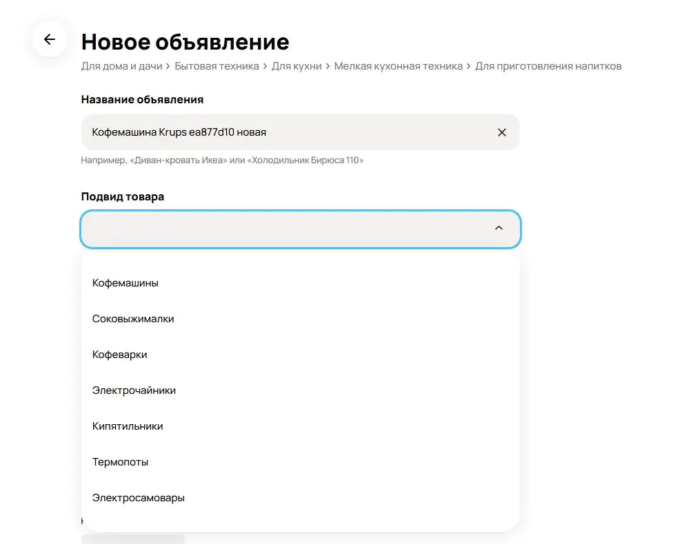 После выбора основной категории уточните товар через строку «Подвид товара» — это дополнительно влияет на видимость и точность выдачи.