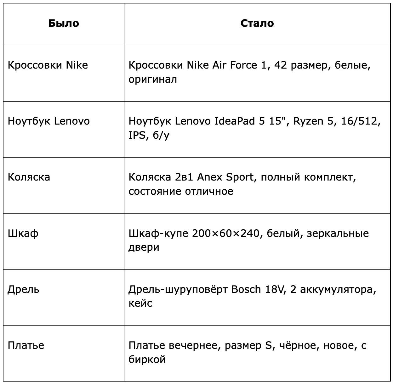 Важно уходить от общих слов — они не помогают попасть в поиск и не объясняют, что именно продаётся.