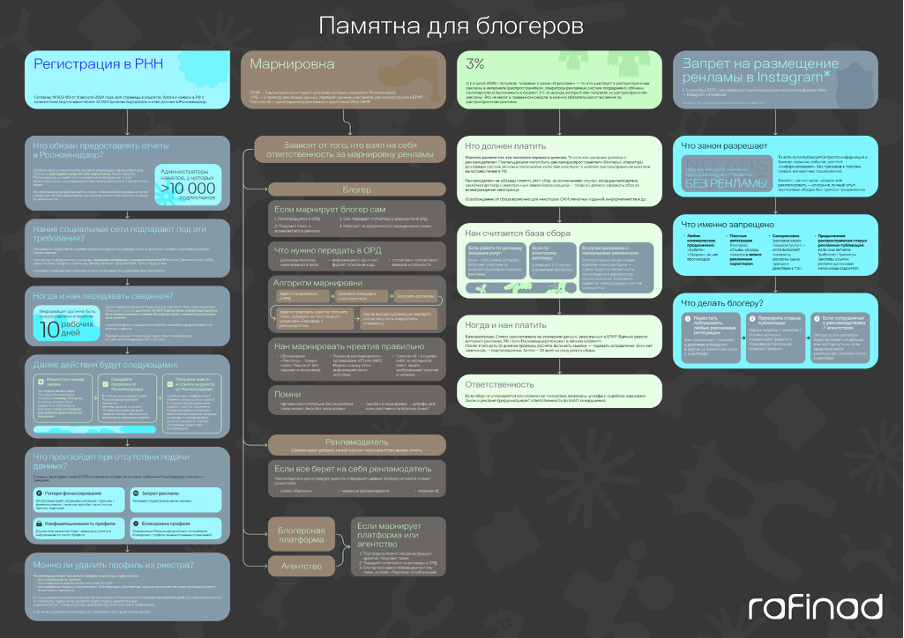 Чтобы упростить этот путь, команда платформы Rafinad собрала все ключевые требования в одном месте — и оформила их в виде наглядной визуальной карты. В ней показан весь путь рекламной интеграции и последовательность действий, которые нужно выполнить, чтобы реклама соответствовала требованиям законодательства и запросам бренда.