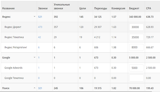 Количество заявок и звонков в разрезе канала рекламы. Можно смотреть и оценивать, какие каналы работают лучше.