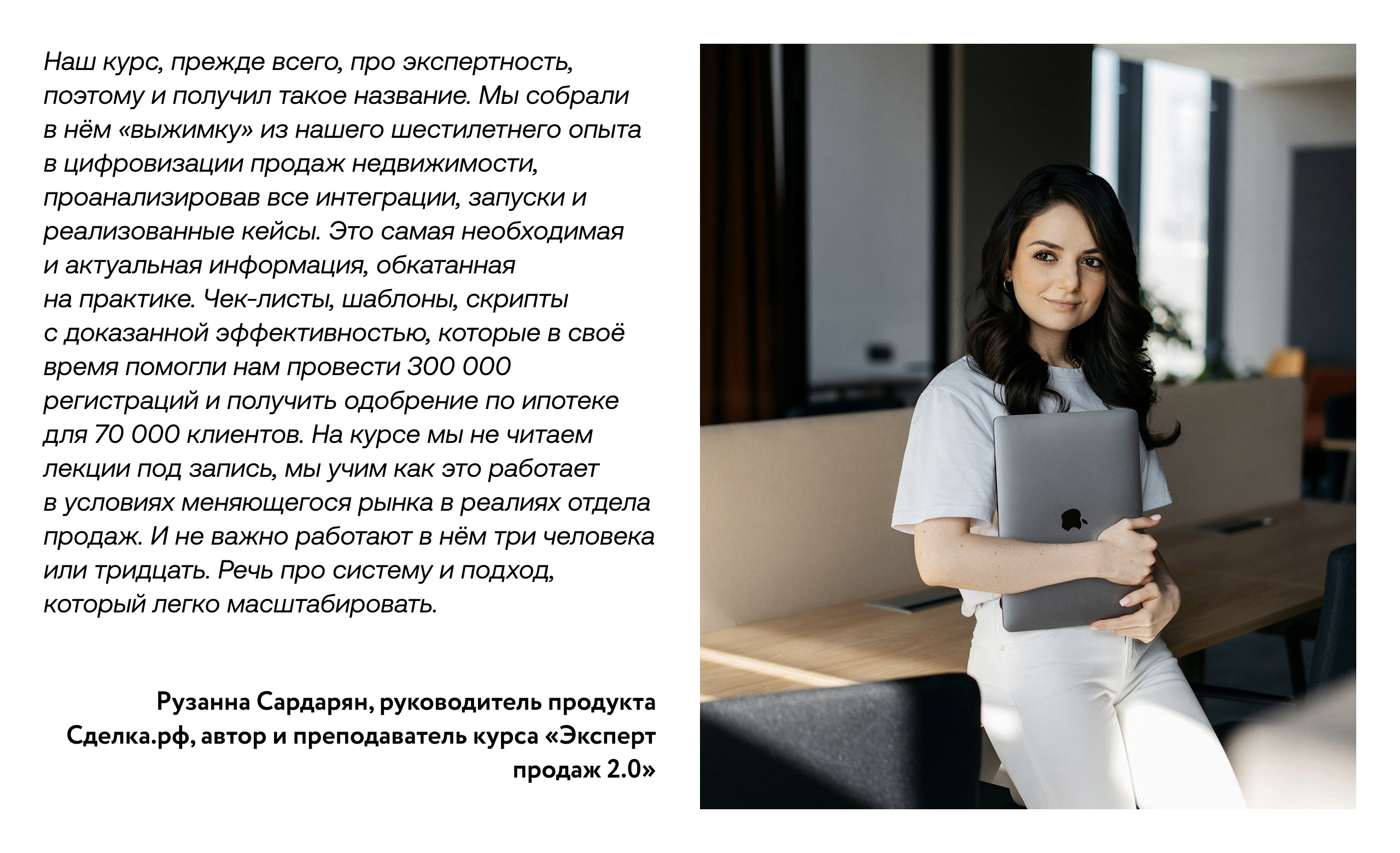 Благодаря расширенной отраслевой экспертизе, насмотренности и разнообразному опыту команда Сделки.рф смогла разработать уникальный образовательный трек «Эксперт продаж 2.0». Обучение основано на практической работе с 400 застройщиками в 60 регионах России.