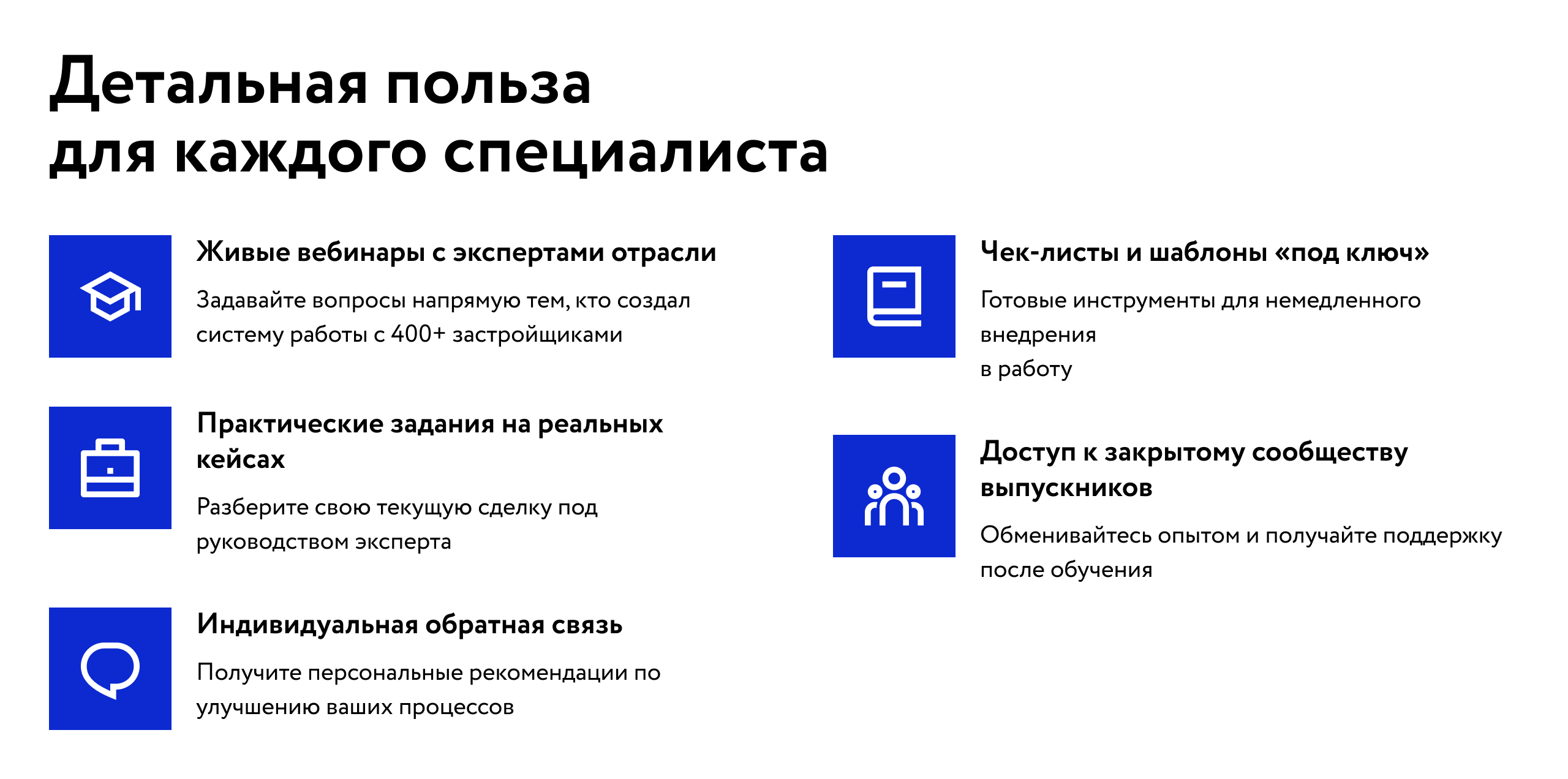 По мере изучения программы студенты смогут задавать вопросы в режиме онлайн и вживую общаться с экспертами, а также получат персональные рекомендации по улучшению собственных процессов, готовые шаблоны и чек-листы для внедрения в работу. Все практические задания — реальные, а не выдуманные сделки и ситуации, которые будут прорабатываться вместе с преподавателями. После прохождения курса студентам будет открыт доступ к закрытому сообществу выпускников для обмена опытом и нетворкинга.