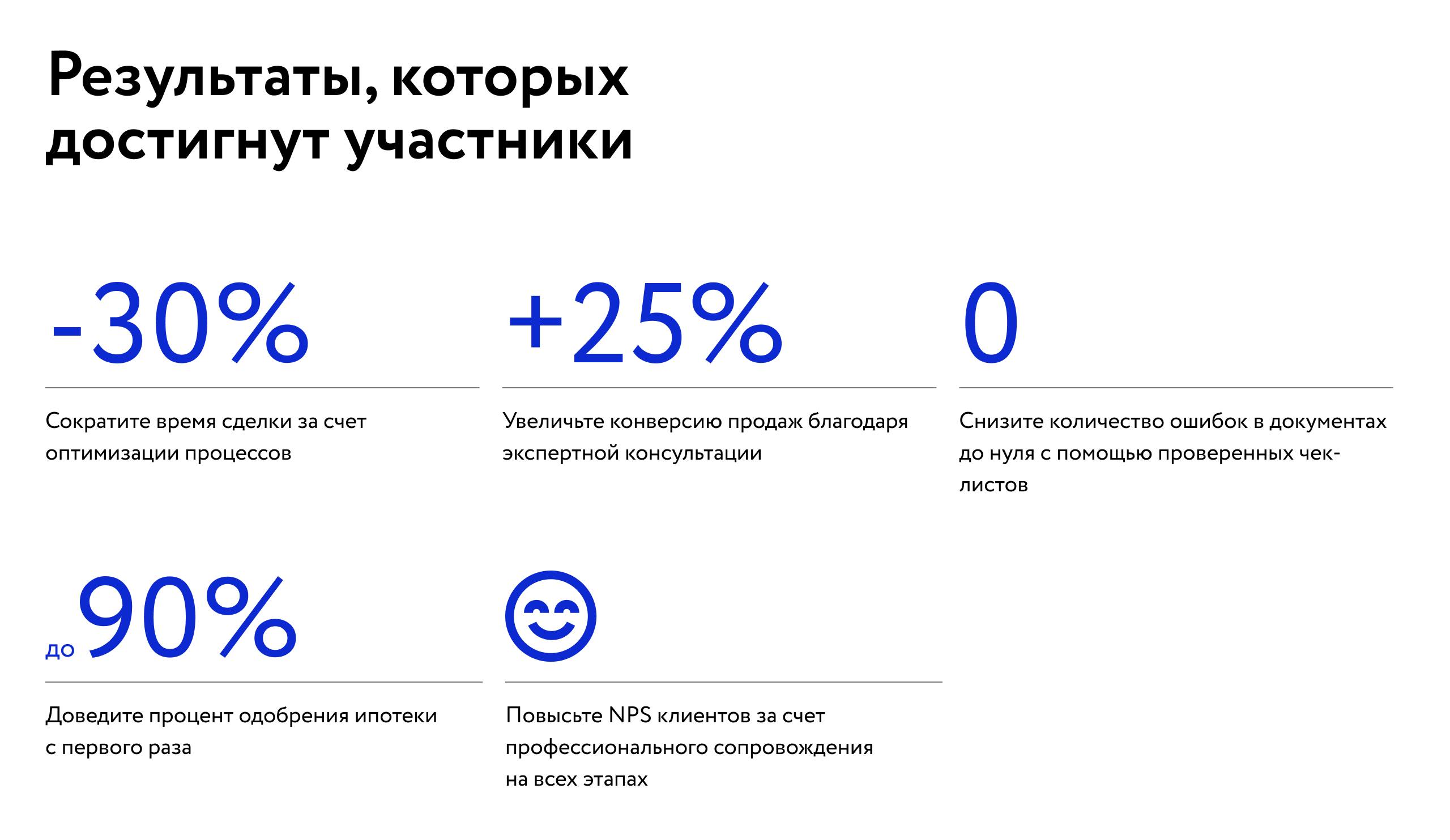 Руководители получат данные о среднерыночных показателях и инструменты для оценки текущей работы менеджеров; научатся принимать стратегические решения по сотрудничеству с банками; выбирать финансовые и юридические механизмы работы; смогут объективно оценивать квалификацию менеджеров, юристов и брокеров.