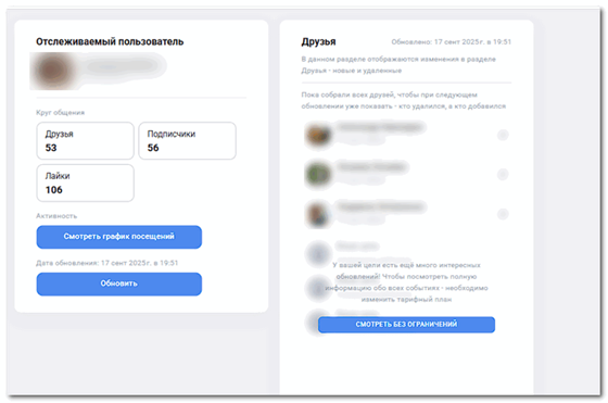 Платформа для анонимного мониторинга профилей ВК: онлайн-активность, друзья, лайки, комментарии, Сторис. Регистрация через email; отчеты по активности.