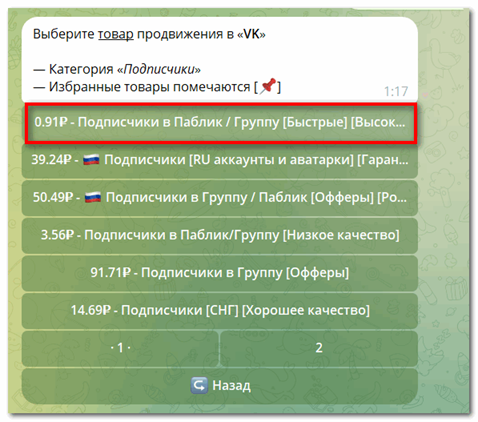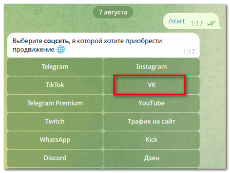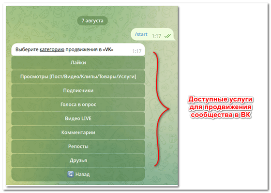 Благодаря Телеграм-боту можно продвигать посты в ВК, личные страницы или чаты. В списке услуг, по социальной сети, вы найдете услуги разбитые по разным категориям. Выбирайте раскрутку страницы с несколькими вариантами активности: так алгоритм не заподозрит, что вы добавляете подписчиков или комментариев сторонним инструментом.