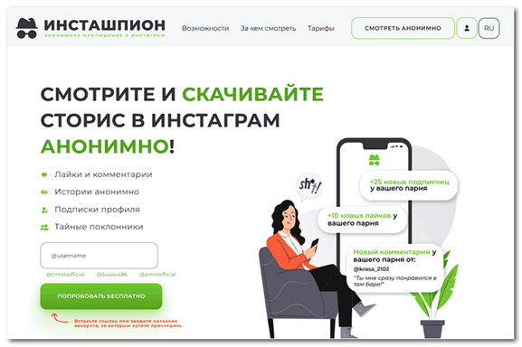 Сервис InstaShpion – это выбор тех, кто экономит свое время и желает постоянно находиться в курсе последних событий. Вы можете подключить сразу несколько аккаунтов и получать уведомления по каждому. Сервис работает по принципу просмотра данных без участия в них пользователя: вы только указываете никнейм аккаунта, который нужно посмотреть, а сервис обрабатывает данные и отправляет вам оригинальном формате.